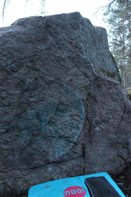 Stand start, follow the diagonal crack straight up, arete on the right eliminated, everything right from the right crack/arete eliminated