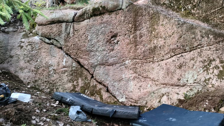 Stand start at the right side of the rock. Traverse left along the upper crimp rail and top out when you reach "Mäyrän Jäynä".
