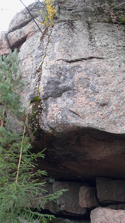 Aid climbing route. Start from the roof and follow thin crack line to the top of the cliff