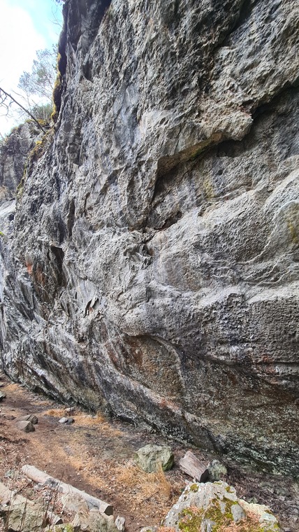 A brutal boulder finishing in easier climbing. First ascent done with clipping all bolts.