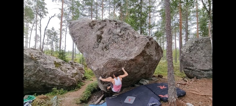 Kongsgården is a place in the forest with several boulders next to each other in almost a circle. 'Kongen' and more specific one boulder problem named "Kongelinja" is a bit high, or the rest is relatively low boulders. Nice for those not liking height and for children. Good landing on most problems. 2-3 crashpads needed on "Kongelinja", but the rest of the problems are pretty safe with 1 crashpad and a spotter.