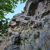 Pretty spectacular outdoor mini climbing gym with overhanging shorter routes that fit perfectly for some after-work training on hot summer afternoons and evenings. This is a short but very steep crag that offers routes with big roofs and plenty of jugs along pretty spectacular 3-D formations. A couple of easier climbs at the flanks that are quite nice as well make it worth a visit even if you don't climb so hard. The routes are between 8 and 14 meters long.