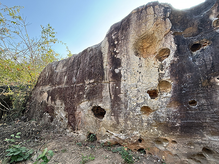 Sit. Start with your hands in the huecos, climb straight up with a few huecos to a somewhat overhanging white face, and then exit on top of it. If you wish to keep the grade, avoid crossing to the right.
