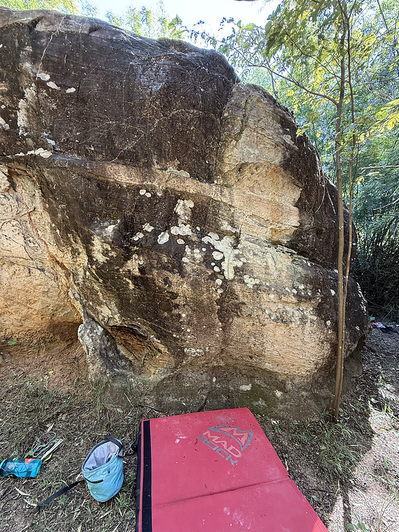 It begins on a large formation, sit start and climb straight up with solid grips, and exits with slopers.
