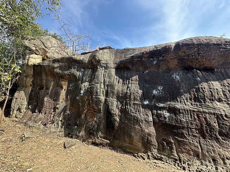 Beautiful line with four compression moves to a sloper hueco. Climb up to small slopers and a long reach to an iron formation to the right and reach for the ledge to exit.