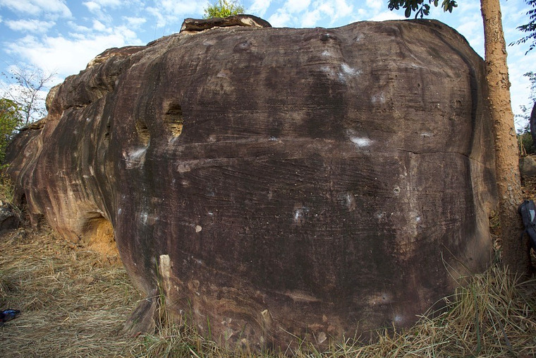 Start in the hole with both hands on the upper lip. Reach up to a thin and sharp crimp. Then move to a vertical small crimp for the right hand to help you dyno to the sloppy hueco to the right. Exit straight up.