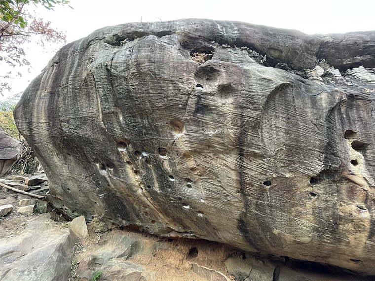 Start standing on two minor crimps, make a long dyno to a hueco, then campus through several huecos to a small dyno before the ledge. Gain the ledge and traverse right to a vertical crack, climb the crack to top out. Descent via fixed rope on the backside of the boulder.