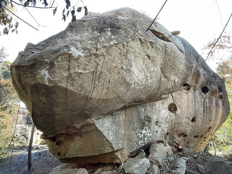 Starts on two shallow hues, to a small overhang, climbs straight up with a 90-degree angle undercut, and up.