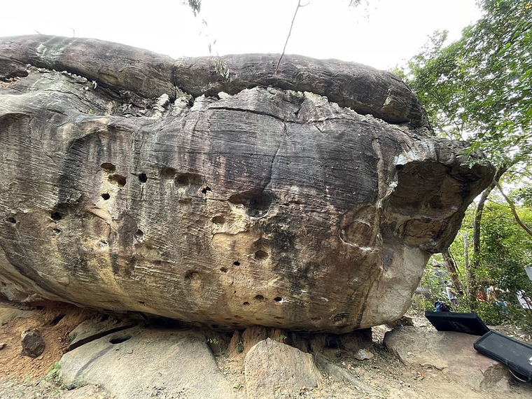 Stand start following the huecos to the ledge, then continue up through the crack to top out. Highball - if uncomfortable with the exposure, bail before reaching the large ledge.