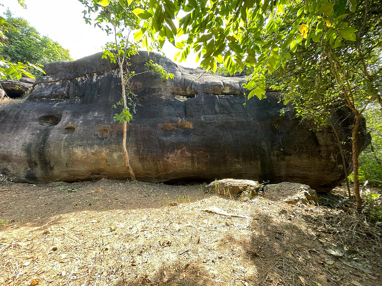 Start: Standing start with both hands in sloping hueco. Moves: Poor footholds make for a hard start, then climb to an OK top-out.