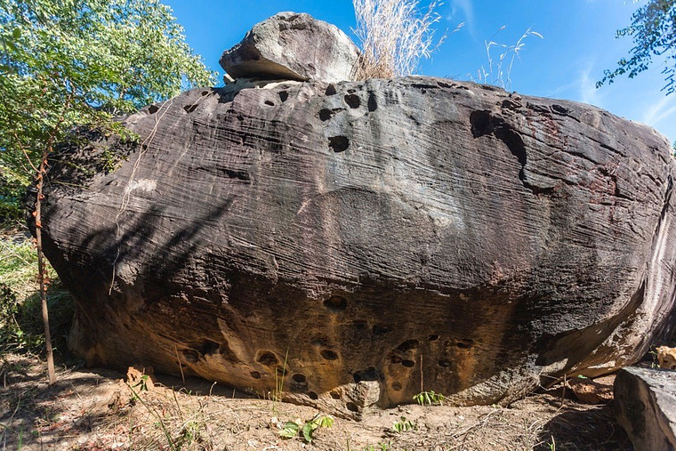 Sit start with some small crimps over the overhang. Exit on huecos right under another slab boulder on the top.