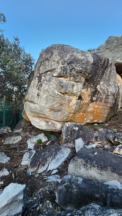 Awkward SDS in lowest rail. Climb up through the arete on good rails and top out on the left side slab