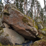 A boulder with something unusual for the region - very steep overhang and there are actual holds! In addition to being an uncommon occurrence it also has some nice climbing.