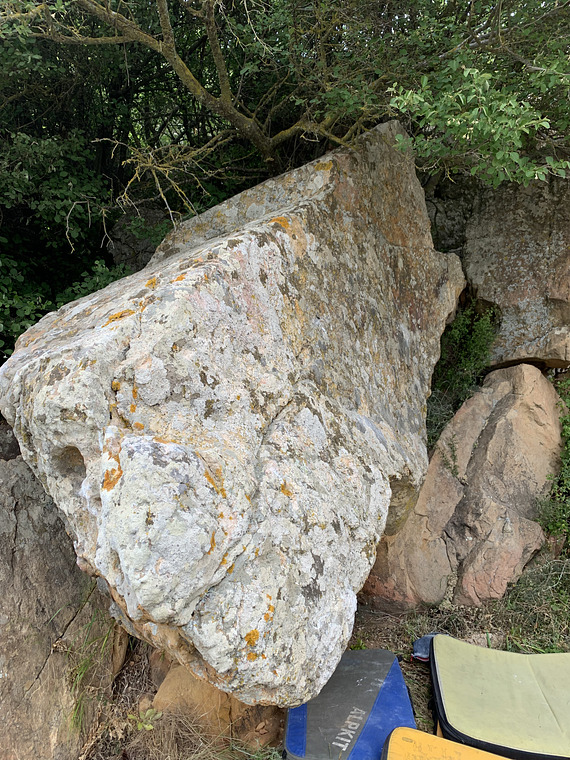 Start sited at the juggy hole and traverse the lip and around the corner to top out same as "Jaws".