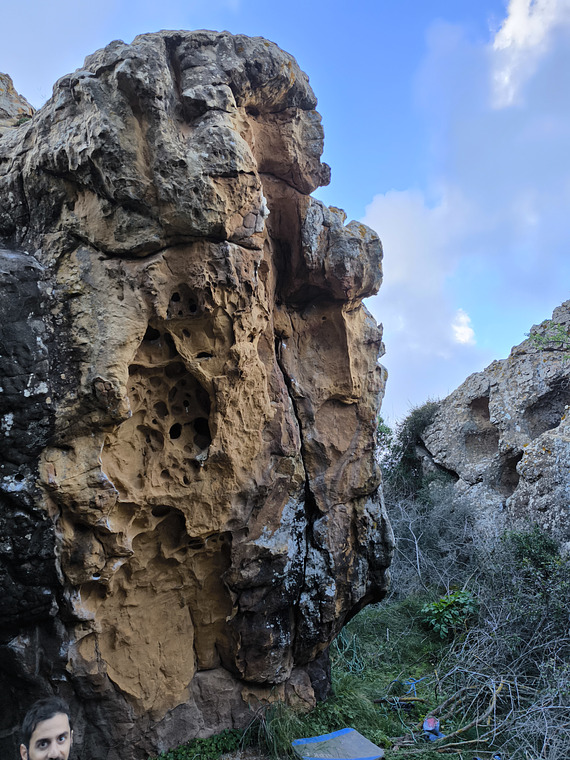 Climb the longest line on the overhang through a series of large pockets and flakes. Be careful of hold breakage due to soft rock and not much traffic.