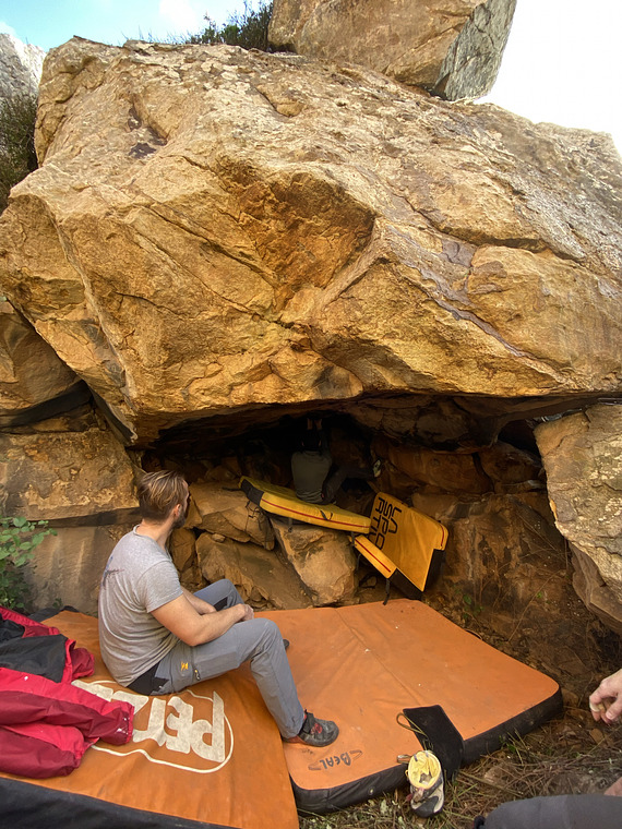 Sit start on the small fallen boulder and use the crimp slots to come out