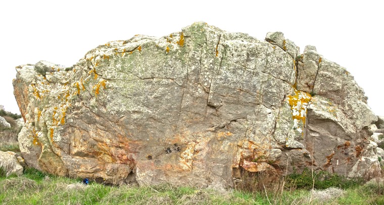 The first problem on the north face starting from the left. Sit-start low on jugs and make a cross-move to a good flat edge on the left and then further left to a perfect scoopy hold before topping straight up.