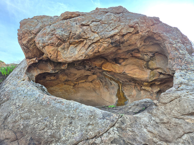 Start on the two good holds in the back of the cave, moving straight out, slightly left for the top-out.