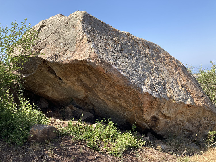 Start sited low under the overhang and climb up through large flakes/jugs.