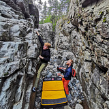 Buldrestein like ved bredden av elva Rukkedøla. Passer best når elva ikke er på sitt største. Potensiale for flere buldere. NB! Ikke barnevennlig, det er fare for å falle ned i elva hvis man er uheldig!