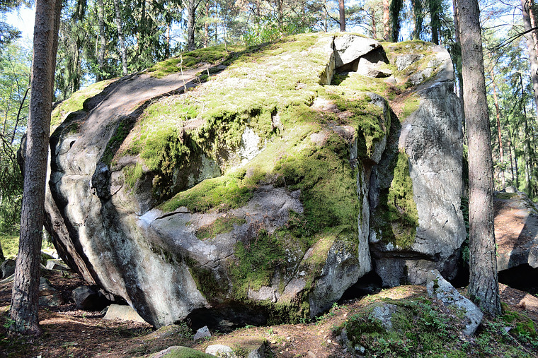 Originally started right hand on slouping arete, left hand under the rock. -> Hugging the stone