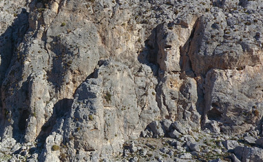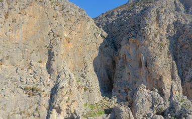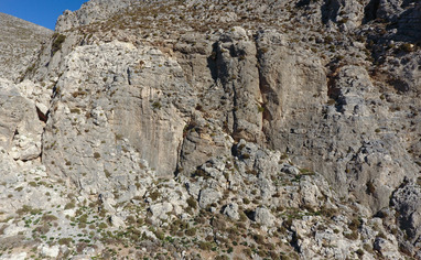 From Massouri take the road to Emborios, just before you enter the village on a sharp left bend there is a white marker on the right side of the road. Park sensibly being careful not to affect residents access. Walk up the short dirt road, go through the gate and up the trail towards the ancient wall at Kastri main. To get to Kreissaal turn left and keep walking until you are just past the big cave. For Sophie turn right at Kastri main and continue upwards for another 5 minutes following the blue marks.