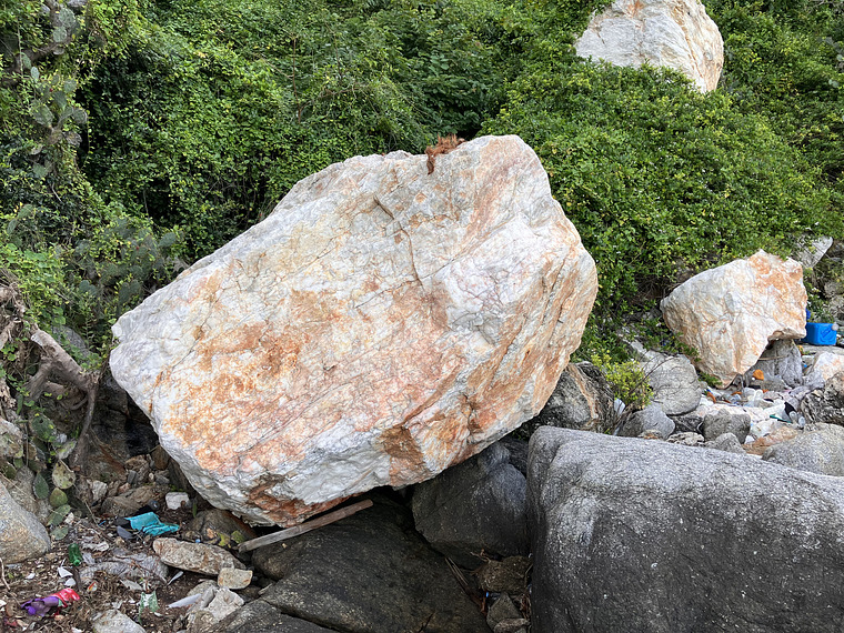 SD on the left, traverse up and right on ergonomic holds. Totally different rock type than the rest of the boulders.