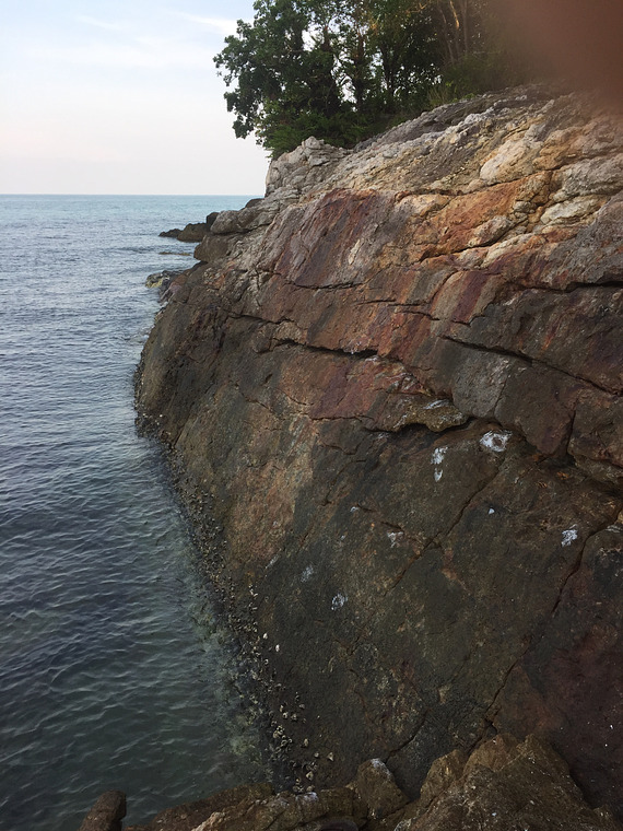 Slippery traverse over shallow water. Probably the hardest of the three. Top edge is off.