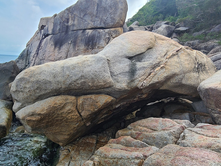 Start both hands on the low edge. Follow the line on cristals. It can be climbed only during low tide!