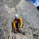 A classic problem of transitioning from one system to a next, on slab. Cruxing on too few pieces of pro for comfort.