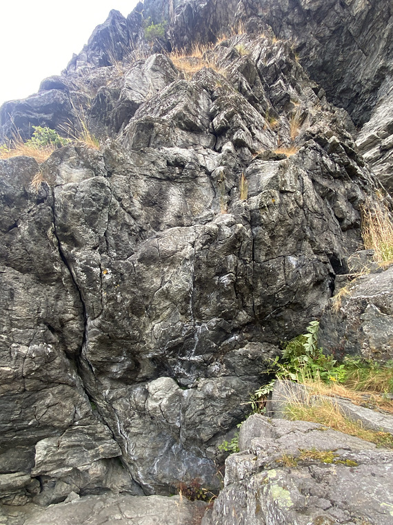 Følg det markerte risset opp til hylle. Gammel topptaurute, høy og psykende uten tau.