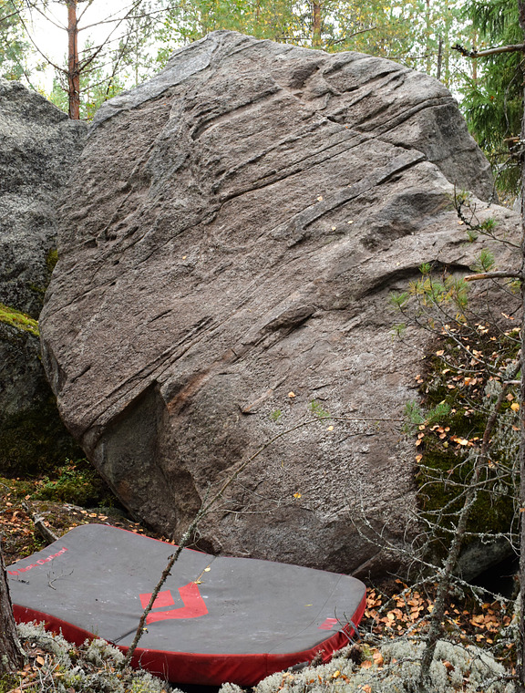 Stand start. Do not use the left arete. Can be climbed with sit start, too, easiest starting from the dent to the right.