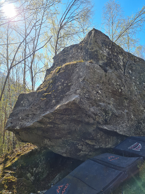 Start at two good holds at left side. Traverse right using footholds bellow edge, follow arete to top