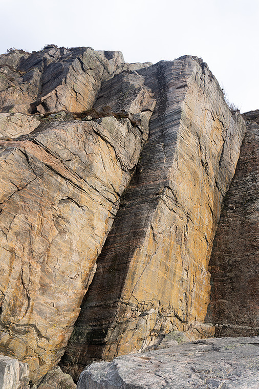 Comprehensiv route starting in the dihedral to the left for "My balls are blue...", in to the chimney and then along formations towards the left to the top. Traditional anchor.
