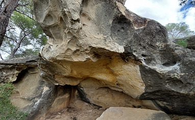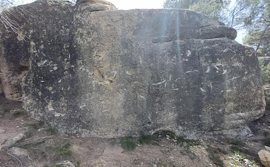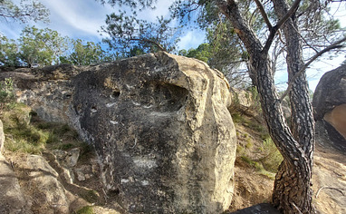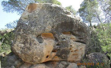 From El Anfibio parking lot: Follow the way which leads towards the river, but bevor climbing down in the valley, continue walking on top of the stunning amphitheater looking like structure on top of the valley and then you are there. The blocks yet established are behinde the edge of the hill. (As hints we made some cairns)