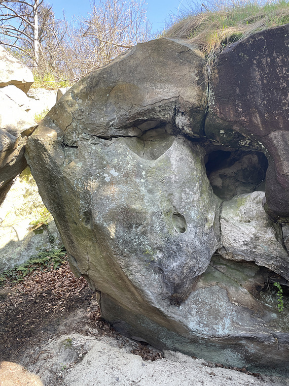 Sit start. Without the the small and the huge pocket on the right. Without touching the boulder that leans onto the side.