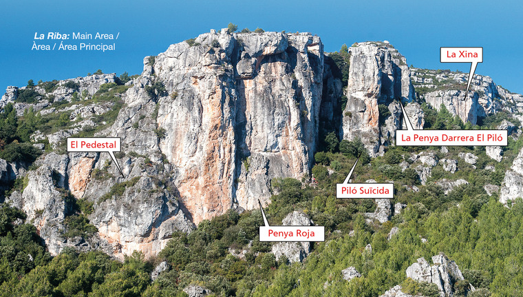 Approach: Begin by following the approach for La Xina/La Penya Darrera El Piló. From the right-hand side of La Xina, continue rightwards on a vague trail passing through jumbled boulders (many cairns). The trail soon reaches the wooded plateau above the crags and becomes more distinct. Keep right at the first bifurcation then continue walking in the same direction, following the trail back down below the cliff line until a short ascent leads up to the base of the left-hand side of the sector (20 min. from La Xina, 35 min. from P).