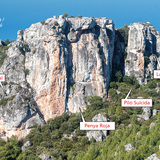 Approach: From the parking follow an obvious path down into and across the riverbed, then past a derelict mill (El Molí de la Font Gran) heading directly towards the cliffs. Approximately halfway between the river and the cliffs, while passing a large boulder on the left, a well-marked trail cuts right off the main path and heads first rightwards and then straight up the wooded hillside, passing to the right of a large pinnacle. Shortly after this the terrain begins to level out and the path splits by a metal signpost: take the left fork (marked Cim de la Penya Roja), which leads up and left to the sector (12 minutes).