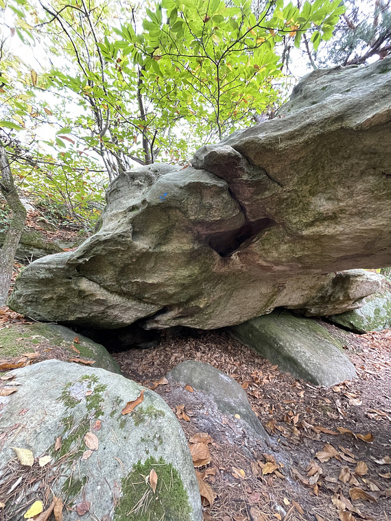 Sitstart to the right outside of the overhang. Climb through the overhang and exit next to blue 30.