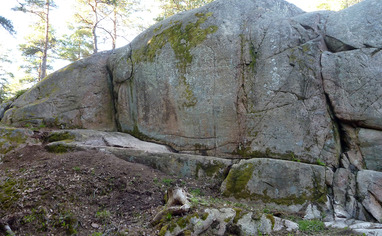 9m hög klippa med flera djupa spricklinjer. 30 sportleder.