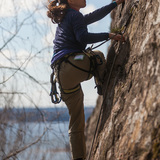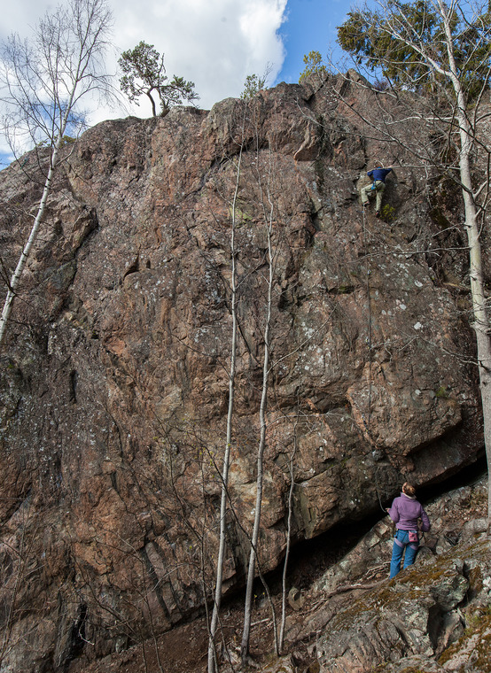 Lilla Vårdberget is almost south-facing and located in sloping terrain behind some leafy trees. It's a warm crag in spring before the leaves strike out, but in summer it might get very hot higher up, above the shade from the trees.