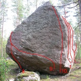 Main block Lintukymi is near the parking area. Next is Sector Kangasboulderi. Further Pohjoinen. There are few other blocks, Please don't climb anything that is not in this topo since area is under development. Updates will appear as soon as projects are climbed.