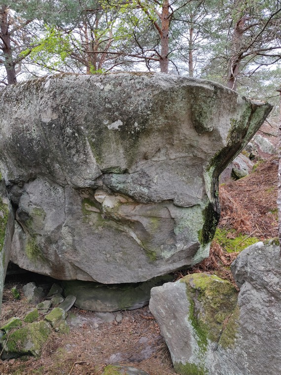 Partir assis (sur un crash-pad pour les plus petits) avec une verticale MG et une prise oblique plate MD, remonter le dévers sans utiliser le bloc de soutien au sol, rejoindre de bonnes inversées et sortir à droite au dessus d'un bloc.