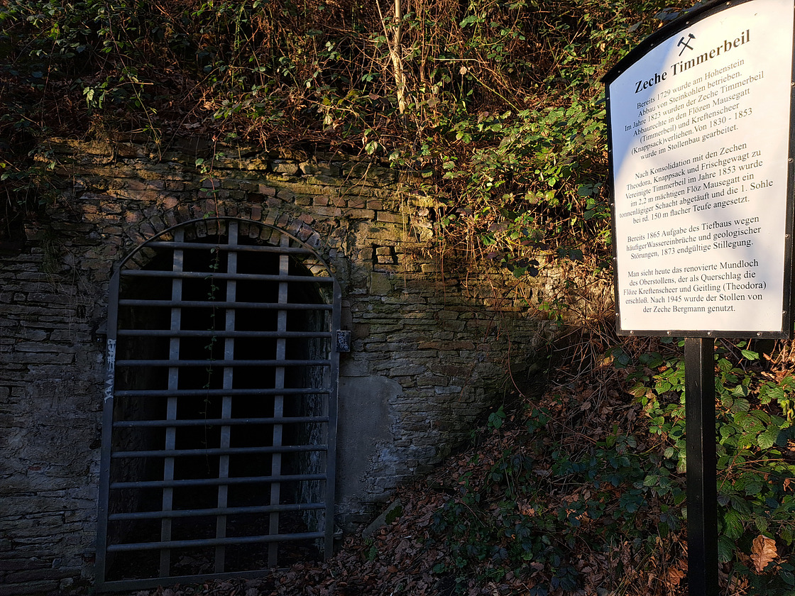 The crag is named after the former Timmerbeil coal mine, which is located in the area. The old mine tunnel, though sealed, can still be found along the access path. The mine began operations in 1828 and ceased operations in 1856.