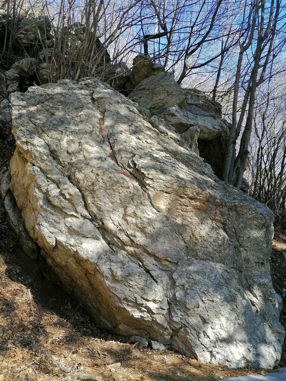 sit start tacchette sotto la banca, eliminante fessurona iniziale, traversa basso verso sinistra e si mantiene all'estrema sinistra del masso per poi uscire in cima