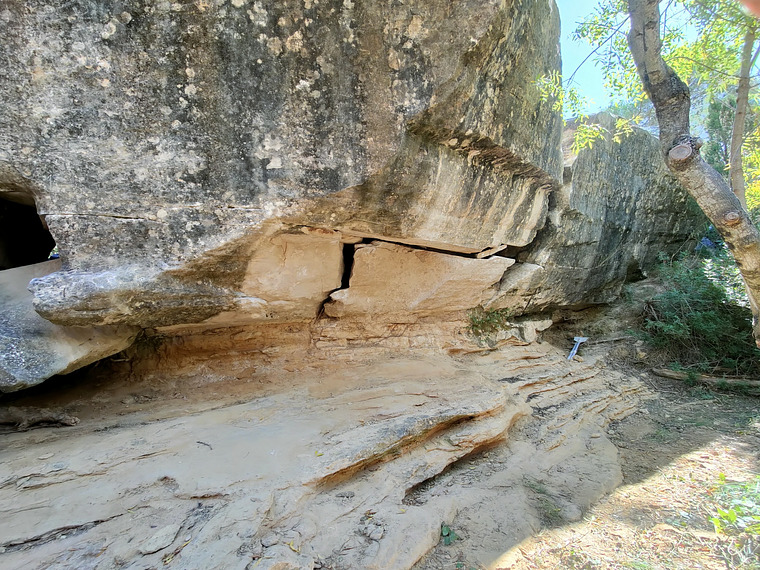 Sitstart, left hand on low crimp, right hand on low jug / horn. Traverse right, eliminate everything below the clay layer, top out right after the vertical crack.