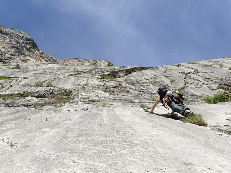The difficulties are generally from 3+ to 5+, but there are also some harder routes as Olocausto, with sequences of 7+/8. There is something even harder, discover it in the topo! The pitches are generally well protected, the routes on the left (till “Claudia”) have a sport character, while the ones on the right are more alpinistic.