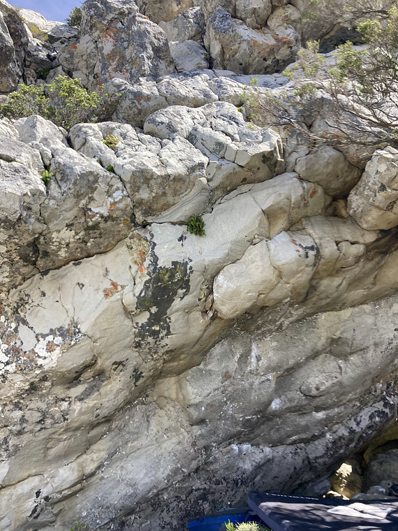 Extension start to Butt guster - start in cave on low block, big move up to rail, climb left into Butt Guster