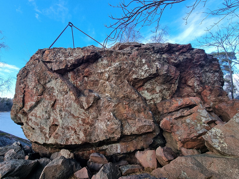 skicka v.h upp längs arêten. Lägg tåkrok någonstans i närheten av högra startgreppet, och slapa vidare h.h längs sloper listen. Finns en ~trefingersficka en liten bit runt arêten, gå till jug rakt up och toppa ur.