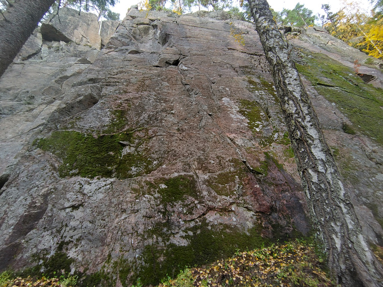 Elegant väggklättring mitt emellan Falköga och Mården. Börjar med lätt klättring upp till en hylla. Här blir väggen slätare och det är bara att följa linjen med borrbultar. Efter sista borrbulten går man rakt upp till en firningsstation. Mellan näst sista och sista bulten kan grön Camalot (0,75) läggas som en extra säkring vid behov.